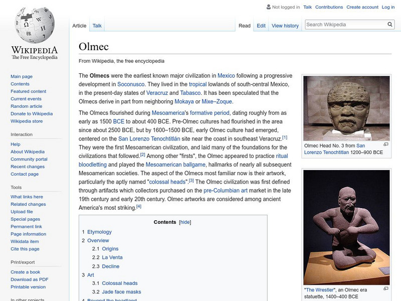 Wikipedia offers excellent information on the Olmec, a people living in south-central Mexico from 2300 BC to about 800 BC.