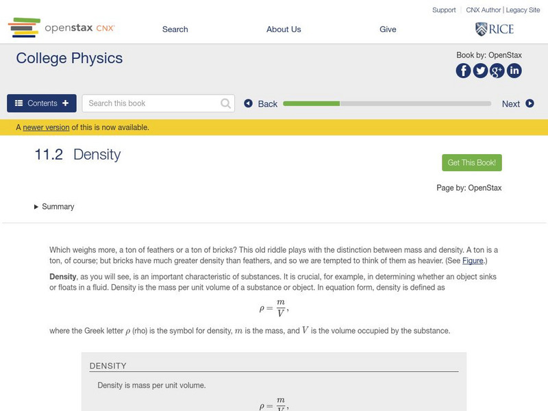 From a chapter on Fluid Statics in a Physics textbook. This section of the chapter defines density, explains how to use a known density to find the mass of a substance, and compares different densities. Includes examples, questions,...