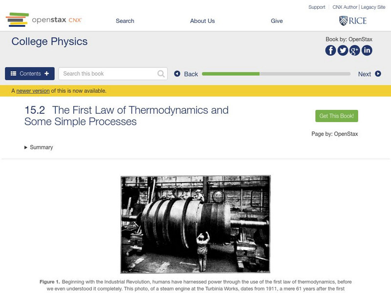 An online college physics textbook that explores the first law of thermodynamics by defining the processes of a simple heat engine. Section also describes the difference among isobaric, isochoric, isothermal, and adiabatic. Students will...