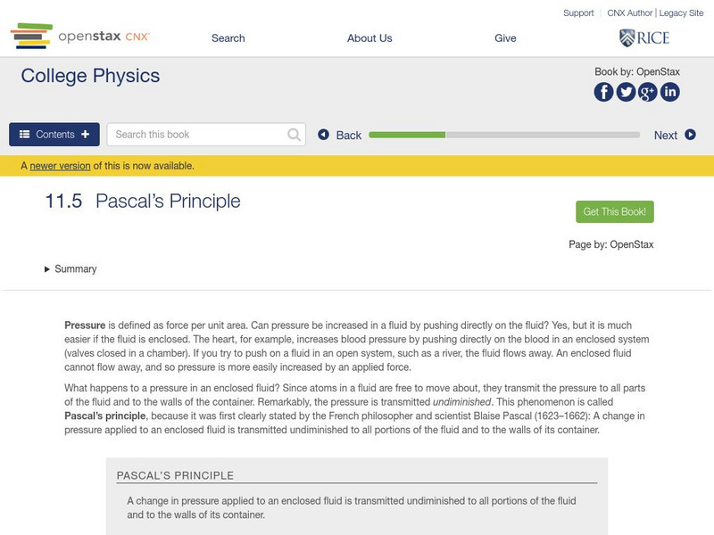 From a chapter on Fluid Statics in a Physics textbook. This section of the chapter looks at Pascal's principle and its applications, and how forces in a hydraulic system are related. Includes problems and exercises.