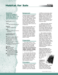 Learners explore how an animal's relationship to its habitat affect the animal's survival. They discuss animal habitats and the animal's relationship to that habitat through the food chain, life cycle, community, and balance of nature....