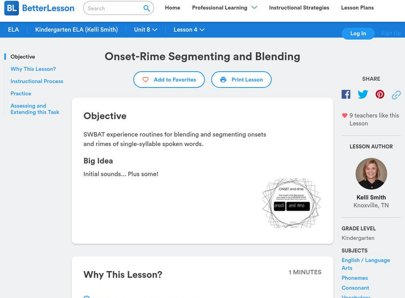 This lesson offers routines for blending and segmenting onsets and rimes of single-syllable spoken words. Included is a video showing students practicing this skill and ideas for centers.