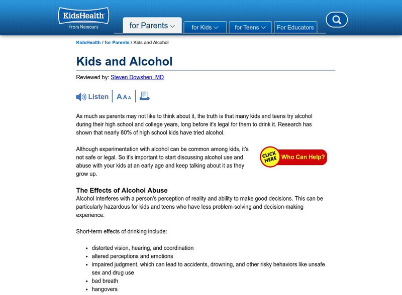 This resource offers information about kids and alcohol abuse. It includes an age-appropriate guide to talking with children about alcohol, and strategies for saying no.