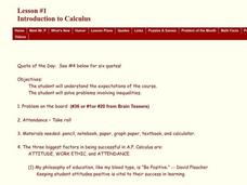 Twelfth graders discuss attitude necessary to be successful in calculus. For this calculus lesson, 12th graders review famous quotes about success to help them get motivated to learn and be successful in the classroom. This assignment...