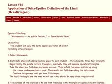 Students create a Hexaflexagon using a formula. In this calculus lesson, students apply the definition of delta epsilon as it relates to limit to create a shape using creases. They relate the same rule to triangles and investigate angles.