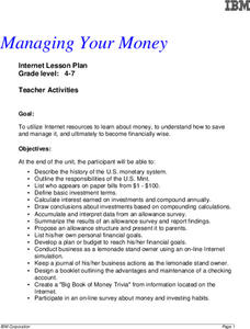 Students use the internet to gather information on saving money. They describe the history of money and the responsibilities of the United States Mint. They list their own personal goals and keep a journal as they operate a lemonade...