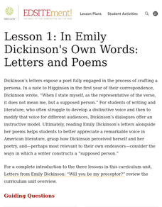 Students analyze how Emily Dickinson perceived herself as a poet. Students read correspondence between Dickinson and her preceptor, Mr. Higginson to determine the depths of their relationship. Students interpret several of her poems.