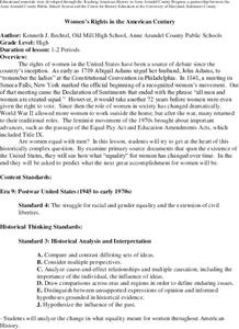 Eleventh graders examine the evolution of women's rights in America. As they analyze primary documents and discuss historical events, learners determine how Abigail Adams, Eleanor Roosevelt, Lady Bird Johnson, Margaret Sanger, and James...