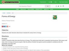 Pupils, working in expert groups, study a form of energy. They plan a slide show presentation using pictures, clip art, and student taken digital pictures that show the energy type they have become experts in. They use a planning sheet...