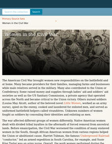 Vivandieres and cantinieres, nurses and soldiers, loyalists and unionists. A primary source set provides young historians an opportunity to investigate the many roles women played in the United States Civil War.