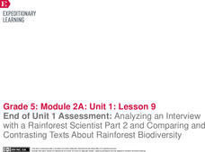 The end is in sight. Pupils complete an end of unit assessment, analyzing an interview with a rainforest scientist and then comparing and contrasting two informational texts. Next, they complete a self-assessment to reflect on their...
