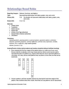 Find the pattern is the name of the game! Learners examine different patterns represented by numbers, shapes, and words. They must describe the pattern, predict the result in a given position, and find an equation that...