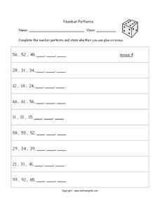 Build the pattern recognition skills of young mathematicians with this simple skills practice learning exercise. Given nine different sequences of two-digit numbers, children must identify the pattern and determine the next three...