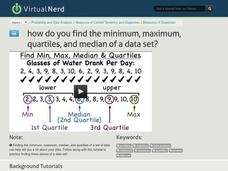 The data sample comes from the number of glasses of water consumed each day by 15 students. You are trying to find minimum, maximum, median, and quartile from this data set. Minimum is the smallest number that occurs, while maximum is...