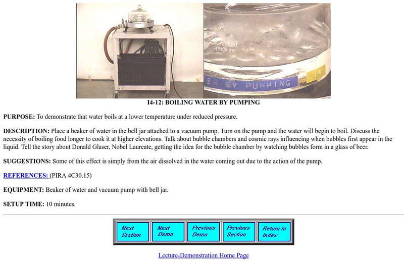 A page from the University of Maryland Physics Lecture Demonstration Facility. Provides directions for a teacher demonstration which utilizes a Bell jar and vacuum pump to show the dependency of boiling point upon pressure. Shows...