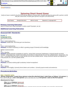 First graders, in pairs, use spinners to experiment with different combinations of letters. They combine letters and determine whether they have produced a word or not. They construct and record words choosing letters from designated tiles.