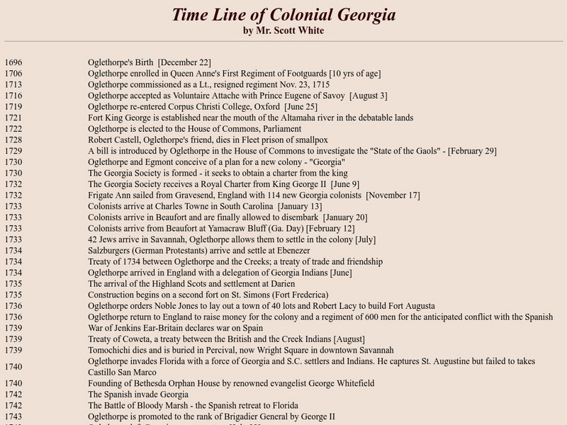 Time line beginning with the birth of James Oglethorpe and ending with his death. Focuses on major events in the history of colonial Georgia, including the granting of the charter by King George and the settlement in Savannah.