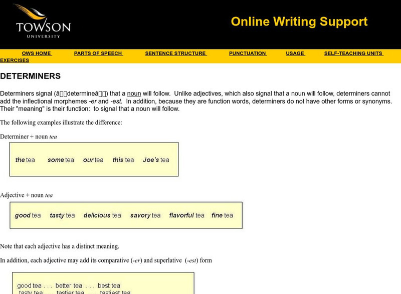 This entry focuses on the types of determiners including articles, possessive nouns, numbers, indefinite pronouns, and demonstrative pronouns and provides examples of each.