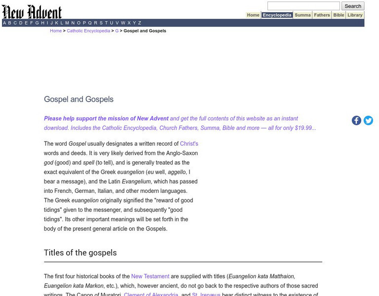 Intelligent look at the Gospels, from an explanation on the titles to the classifications and inconsistencies among them. Please note that ?The Catholic Encyclopedia? is a historic reference source and should be viewed in the context of...