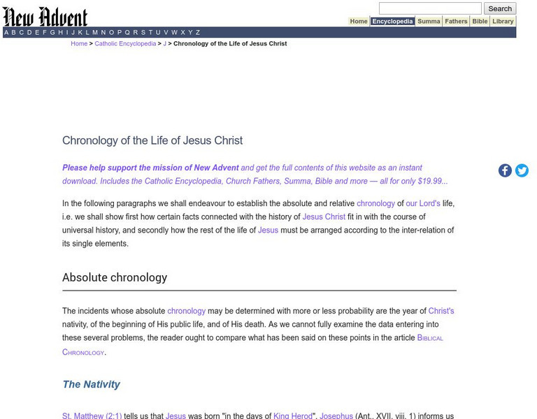 Encyclopedia entry on the life of Jesus presented as a chronology of his life's events. Please note that ?The Catholic Encyclopedia? is a historic reference source and should be viewed in the context of resource material dated around 1910.