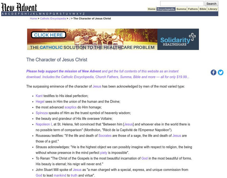Explores the character of Jesus by looking at his relation to man and God. Very in-depth encyclopedia entry. Please note that ?The Catholic Encyclopedia? is a historic reference source and should be viewed in the context of resource...