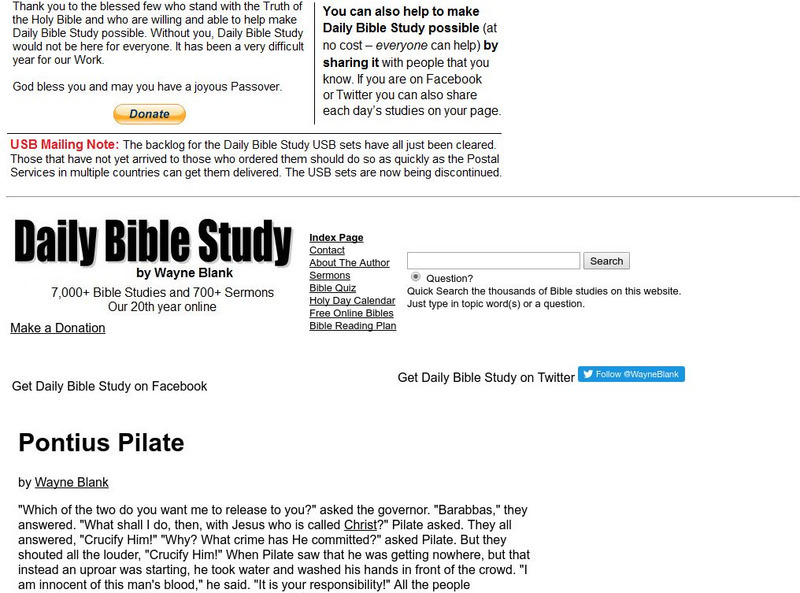 Daily Bible Study offers a biography of Pontius Pilate, the sixth Roman governor of Judea. Focuses mainly on his dealings with Jesus, whom he eventually condemned to die.