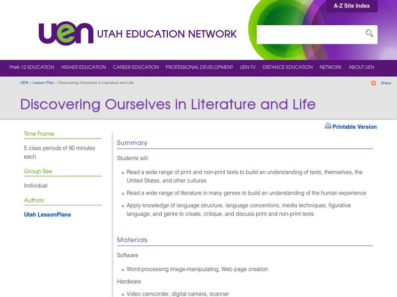 This lesson plan, provided by the International Society for Technology in Education (ISTE), encourages young scholars to evaluate literature in a variety of multimedia formats and answer the question, "Who Am I?," Students are then asked...