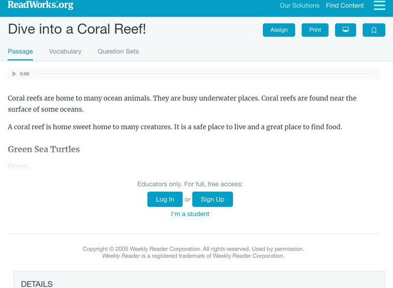 [Free Registration/Login Required] An informational text about some of the animals that live in a coral reef. A question sheet is available to help students build skills in reading comprehension.