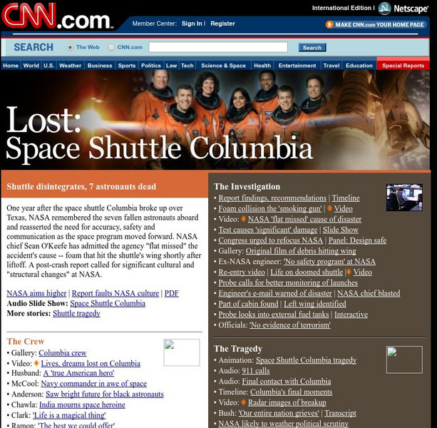 CNN.com provides a thorough look at the Space Shuttle Columbia disaster. Here, read press releases, watch videos, view images, and use interactive programs.