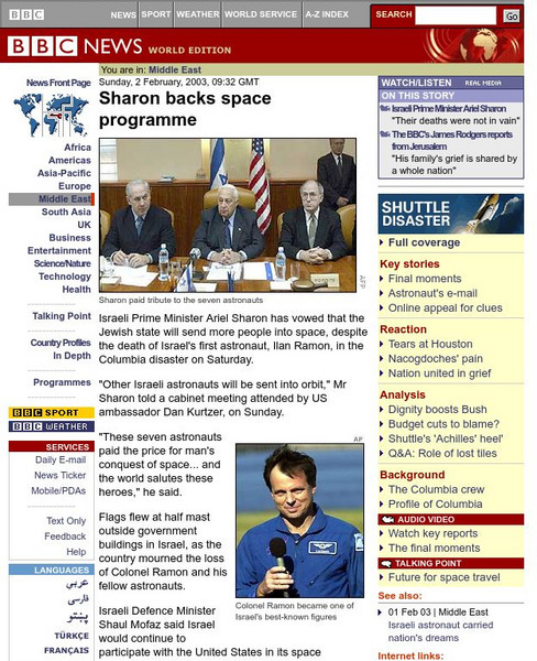 The BBC explores the Israel's reaction to the Space Shuttle Columbia tragedy and the death of Israeli astronaut Ilan Ramon.