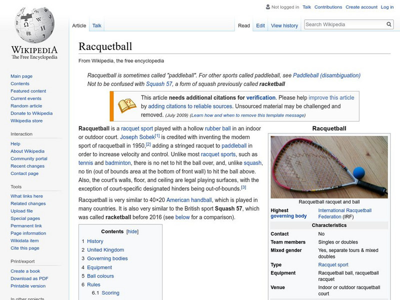 This encyclopedia article from Wikipedia on racquetball discusses how it is played, gives some playing strategies, and describes some different kinds of shots. Links are also provided for further information.