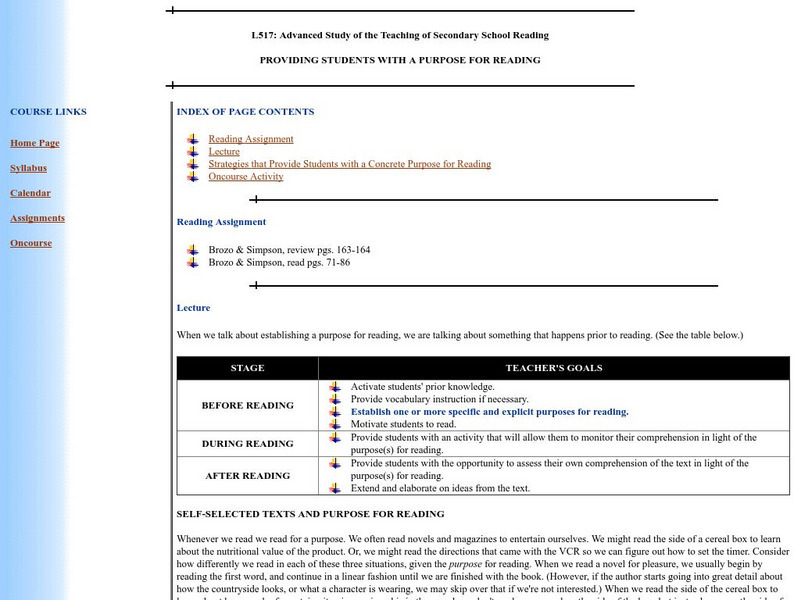 Discussion of providing students with a purpose for reading from a college class site entitled "Advanced Study of the Teaching of Secondary School Reading." Along with discussion and background on the topic, some specific strategies are...