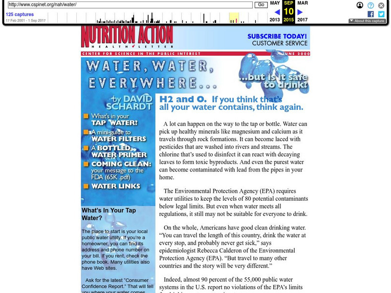 The Center for Science in the Public Interest offers a discussion of contaminants that can be found in tap water and chemicals added to water in the public water systems. The topics discussed are arsenic, parasites, lead, turbidity, and...