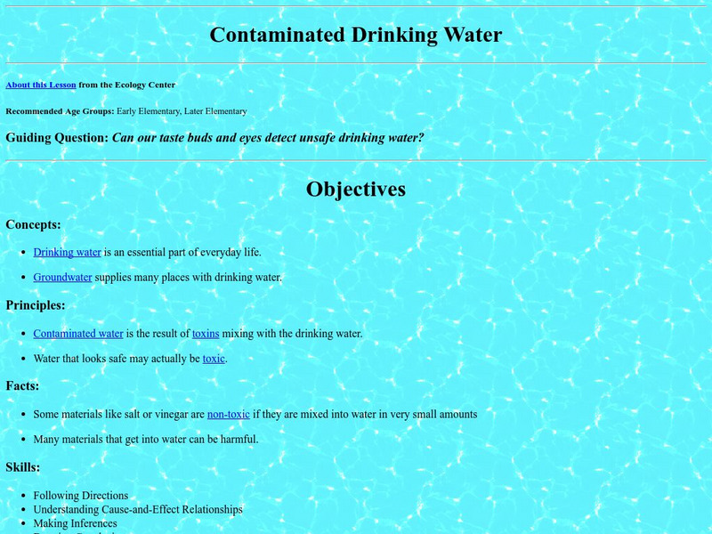 Learners explore water and determine whether or not it is safe to drink. In this water exploration lesson, students are split into groups, to acts as the polluter, taster, and recorder. Learners explore by placing different amounts of...