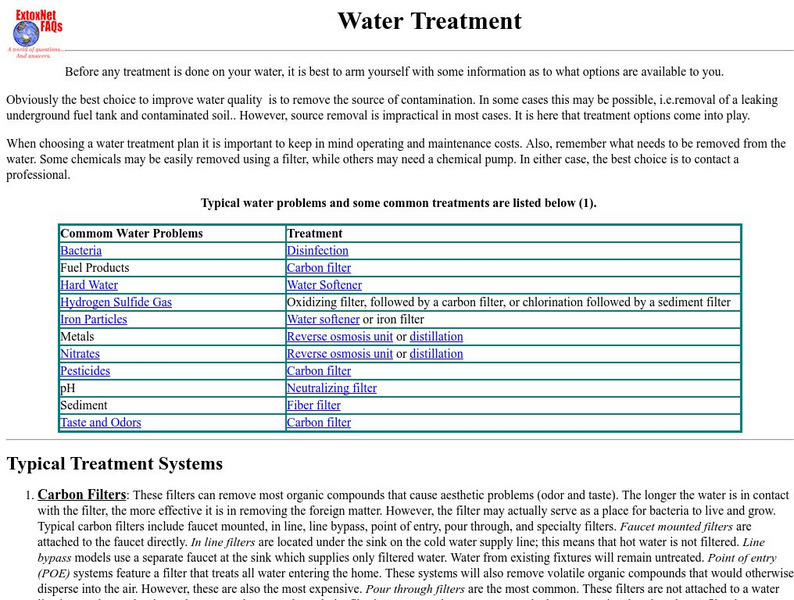 Discusses many options of water treatment, the contaminants that the treatments are focused on, how the treatment works, and common treatment systems.