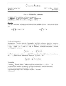 In this contour integration worksheet, students integrate complex functions of a real variable. They sketch the contour and evaluate the integral. This two-page worksheet contains eight problems, as well as explanations and examples.