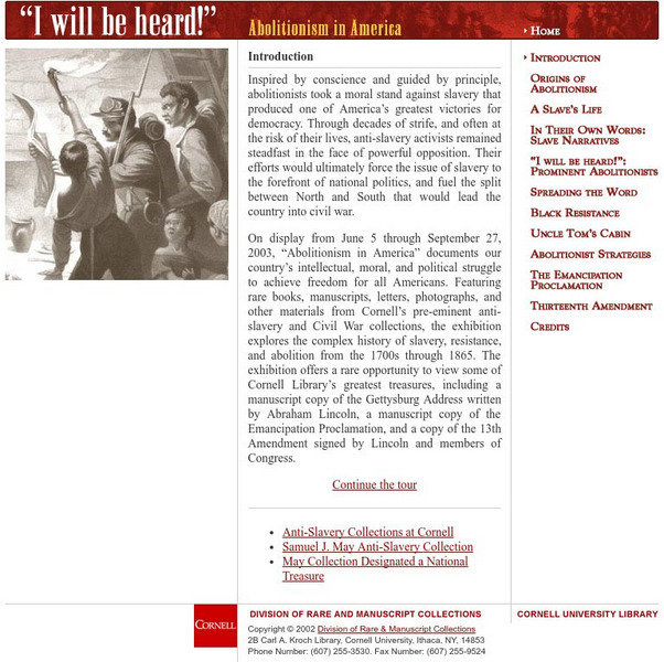 The introduction of an extensive website from the Cornell University Library, which includes text, documents, and other primary sources in an examination of the anti-slavery movement known as abolitionism.