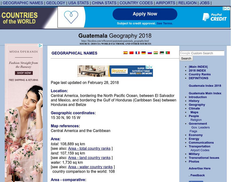 Site describes in point form the geography of Guatemala, giving land mass, major landforms, climate, terrain, and natural resources.