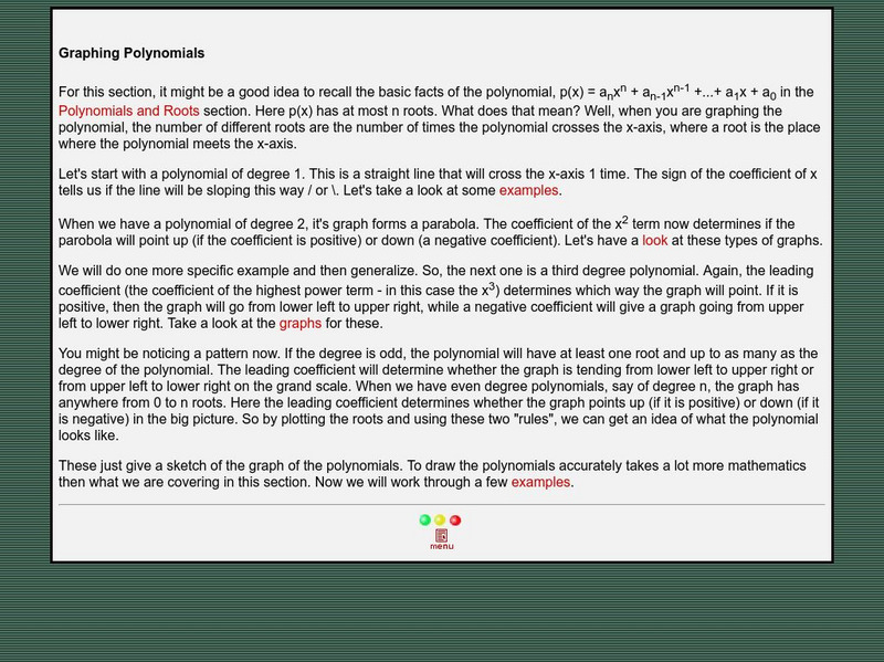 An introduction to the graphs of polynomial functions by looking at the roots of the polynomials, or where it crosses the x-axis. Includes links to pictures of graphs and detailed explanations.