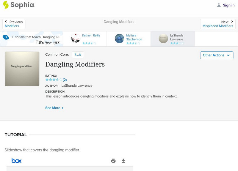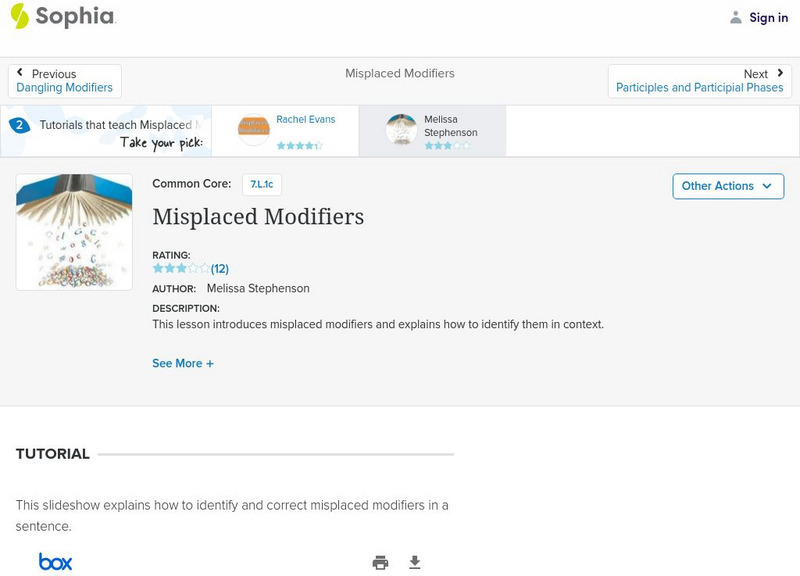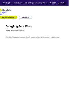 Click through two slide shows explaining what modifiers, dangling modifiers, and misplaced modifiers are and how to correct them. Then watch a video [1:19] on dangling modifiers and a second video [5:13] showing a funny scenario of using...