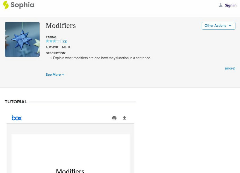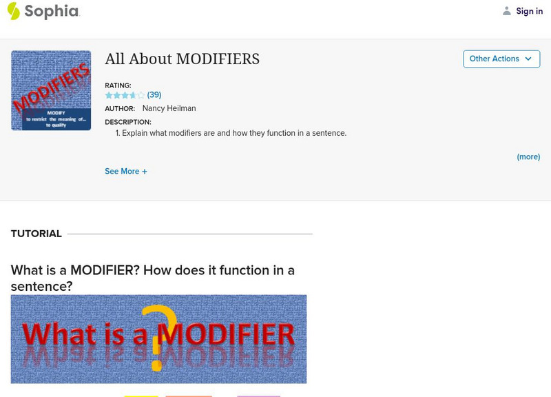 This tutorial provides a slideshow focusing on modifiers; it defines them, explains dangling and misplaced modifiers, gives examples, and tells how to prevent them. There is also a short automated slideshow of a practice example and its...