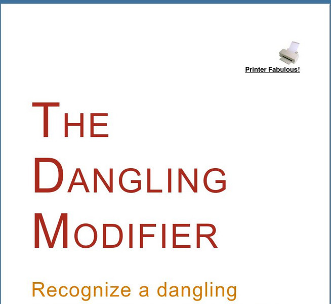 Printable information is provided that demonstrates how to identify a dangling modifier in the context of a sentence.