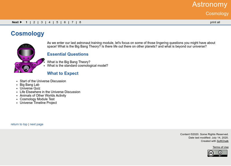 This interactive module will help students understand cosmology. Learn about the standard cosmological model and explore if life is possible in other places besides the Earth.