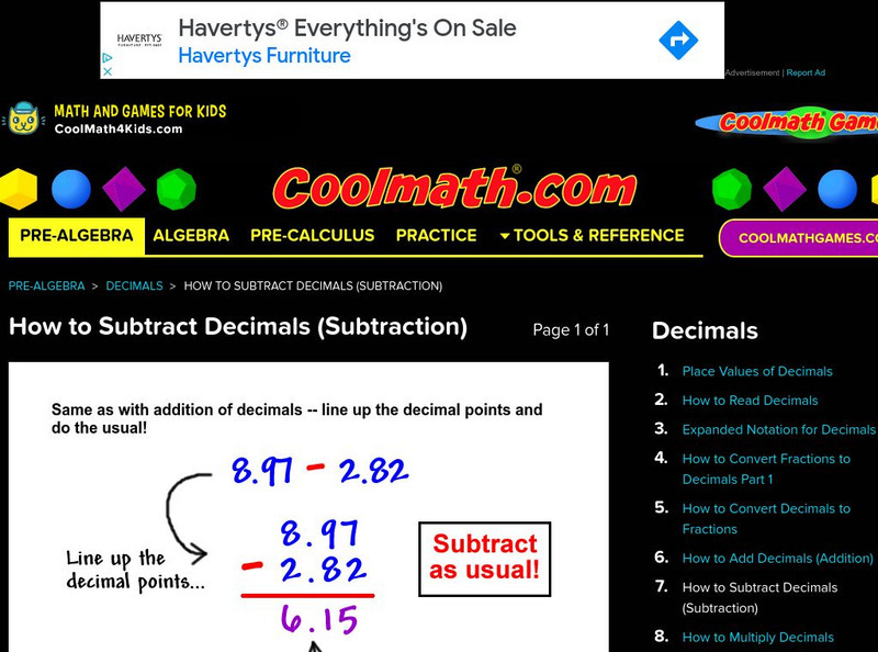 If you are looking for a website that explains and defines subtraction with decimals you have arrived at an excellent resource. There are even practice problems at the very end of the lesson.