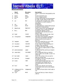 An ELD definitions list, this resource covers travel-related vocabulary in English. However, it does not offer any opportunities for practice. Based on British English.