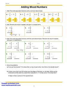 In this mathematics learning exercise, 5th graders add and write the equivalent fraction with a common denominator. Then they add and rename the result if needed giving it in lowest terms. Students also solve each of the word problems at...
