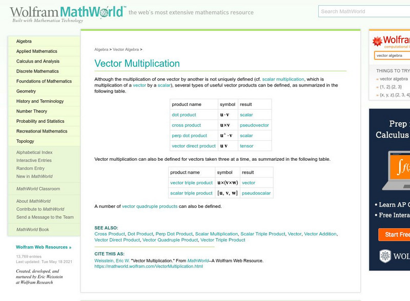 Provides tables for all the types of vector multiplication and the notation associated with them. The result is also given in the table (ie. scalar or vector) this site contains many related links.