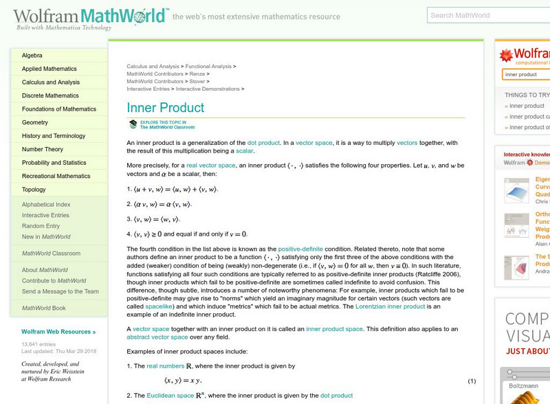 This site contains links to four kinds of inner products: Dot Product, Hermitian Inner Product, Interior Product, L2-Inner Product.