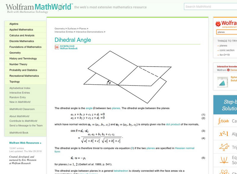 This MathWorld page discusses the dihedral angle, or the angle between two planes that can be found using the dot product of the two normal vectors of each plane.
