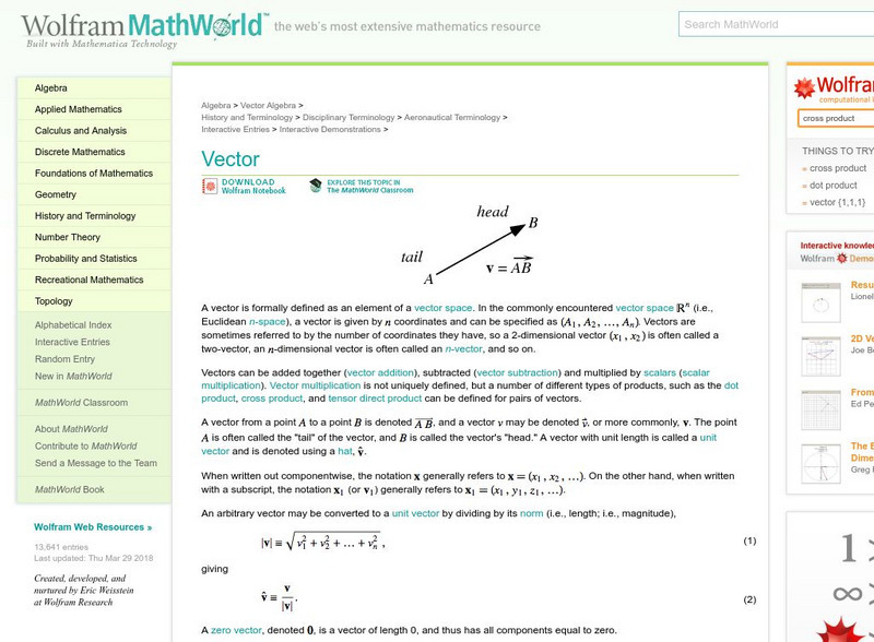 This site from Mathworld.com provides a detailed overview of vectors in algebra, and includes numerous formulas and examples.